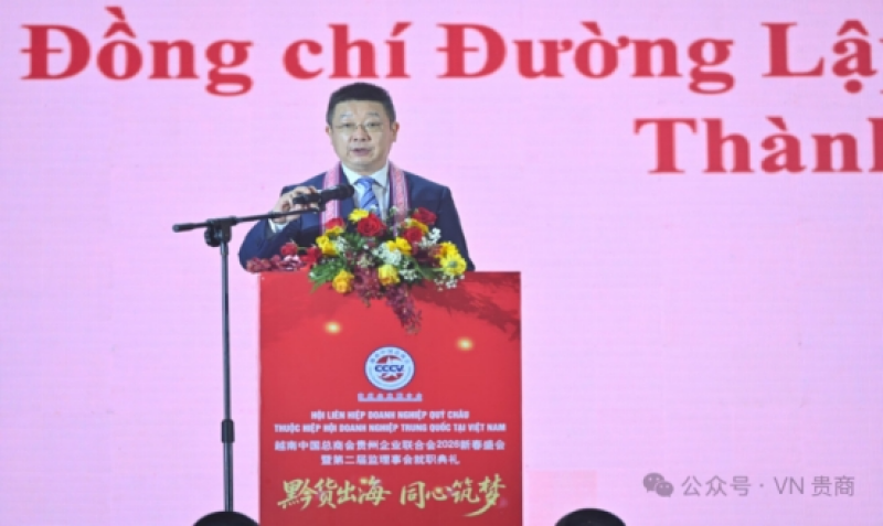 唐立总领事代表总领馆向越南贵州企业联合会新当选的第二届监理事会全体成员表示热烈祝贺,希望新一届监理事会继续发挥平台优势,助力贵州特色产品落地越南,推动双方在新能源、大数据等领域产业对接。