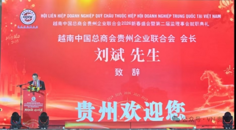 2026年1月3日晚,越南中国总商会贵州企业联合会在胡志明市隆重举行以“黔货出海,同心筑梦”为主题的2026年新春盛会暨第二届监理事会就职典礼。来自中国驻胡志明市总领馆、越南中国总商会以及各兄弟商会的嘉宾、在越黔商代表600余人齐聚一堂,共襄盛举。