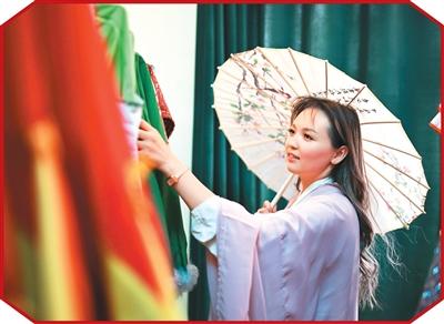 近日,一名学生在吉尔吉斯斯坦奥什国立大学孔子学院挑选晚会上用的服饰。新华社记者 李任滋摄
