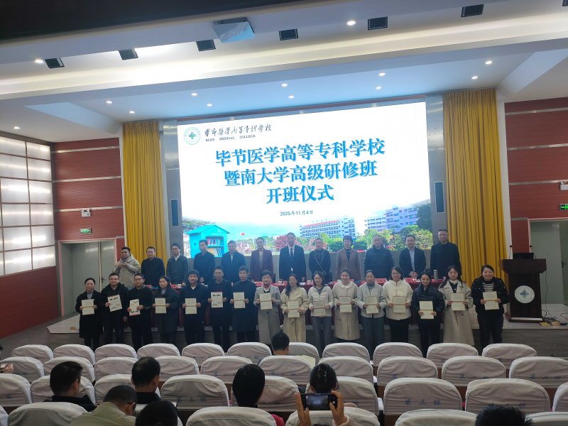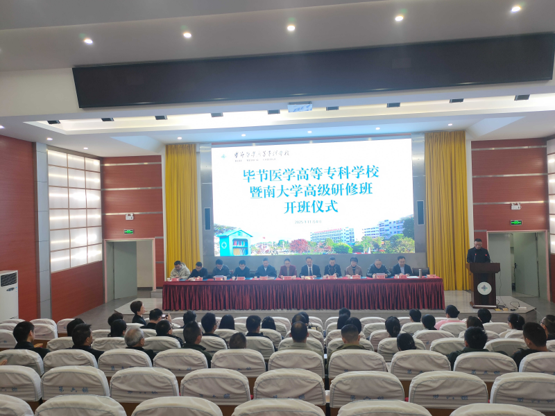 为充分发挥“暨南大学医学教育基地”的作用,推动暨南大学与毕节医专签定《暨南大学与毕节医学高等专科学校共建医学教育基地协议书》的相关事项落实到位,在毕节市侨联的协调推动下,11月4日,“毕节医学高等专科学校暨南大学高级研修班”开班仪式在毕节医专培训中心一楼会议室举行。毕节医专党委书记张体江、暨南大学医学部副主任王颖出席会议并致辞,暨南大学第三临床医学院、暨南大学附属广东省第二人民医院副院长刘红梅,毕节医专党委副书记、校长杨永学,毕节市侨联主席张红梅出席会议。仪式由毕节医专党委委员、副校长许海主持。