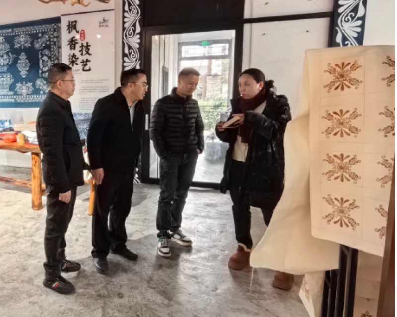 随后,会员代表走进村内百越布依工坊,近距离观摩枫香染“制油—绘图—浸染—脱蜡”全流程工艺,重点了解非遗技艺创新转化、研学推广及带动村民增收等情况。大家纷纷表示,将充分发挥国际视野与资源优势,为枫香染非遗品牌传播、文创产品研发及市场化发展搭建桥梁,推动传统技艺焕发新活力。