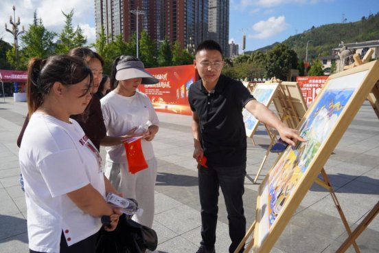 活动现场,一幅幅以爱国主义为主题的水城农民画格外引人注目,色彩浓郁的画面里,既有中秋团圆的温馨场景,也有歌颂祖国发展的生动图景。“以前只知道农民画是咱水城的特色,今天仔细看才发现,每一笔都藏着咱老百姓的生活和对祖国的祝福。” 侨眷张女士驻足画作前,仔细聆听侨联工作人员讲解画面细节,一边感慨。“这样的作品能让海外的亲友更直观地了解家乡变化,我已经拍了好多照片发给海外亲友,大家都夸咱水城文化有特色!” 侨眷李女士则带着孩子参与农民画互动体验。