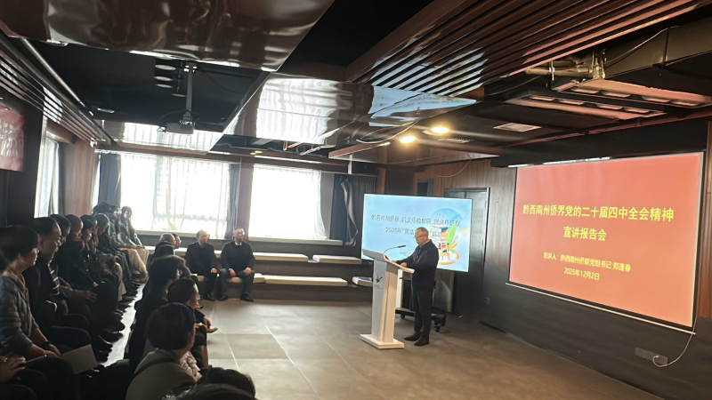12月2日,黔西南州侨联在兴义市“侨胞之家”举办党的二十届四中全会精神宣讲报告会,党组书记郑逢春以“凝聚侨心侨力 共筑现代化伟业”为题,围绕党的二十届四中全会的重大意义、核心要义和精神实质进行了系统宣讲。州侨联领导班子、兴义市委统战部、兴义市检察院、兴义市侨联、归侨侨眷代表、归国留学人员代表及侨联干部等近40人参加了宣讲会。